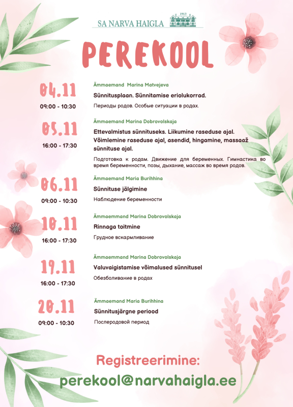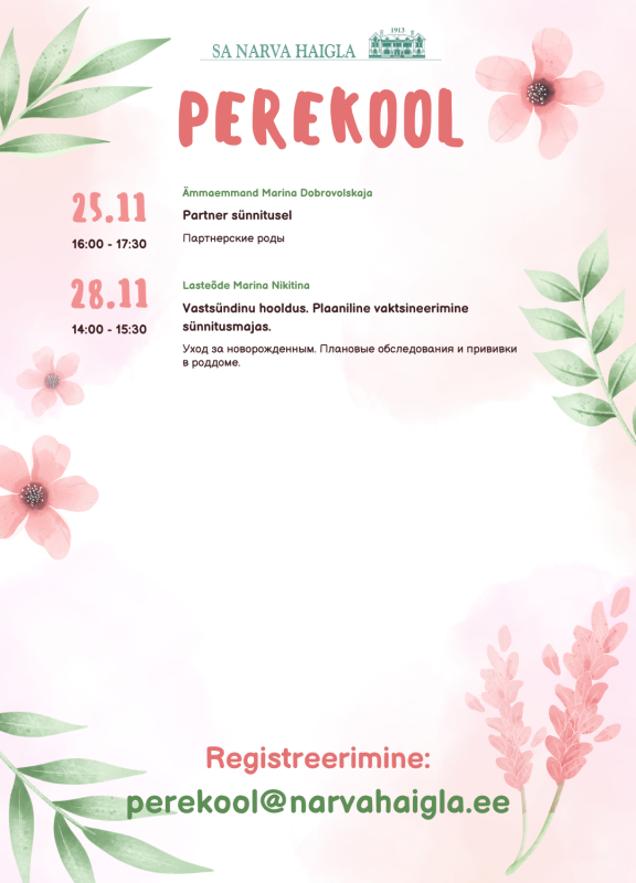 Registreerimine loengutele e-posti teel perekool@narvahaigla.ee (loengu nimi, ees- ja perekonnanimi, e-meil, telefon) või lingil