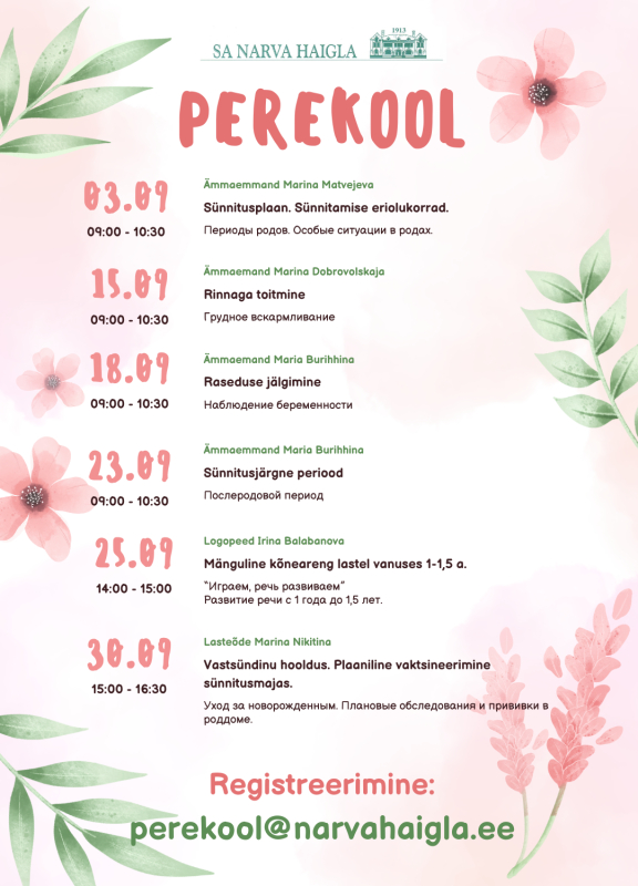 Registreerimine loengutele e-posti teel perekool@narvahaigla.ee (loengu nimi, ees- ja perekonnanimi, e-meil, telefon) või lingil