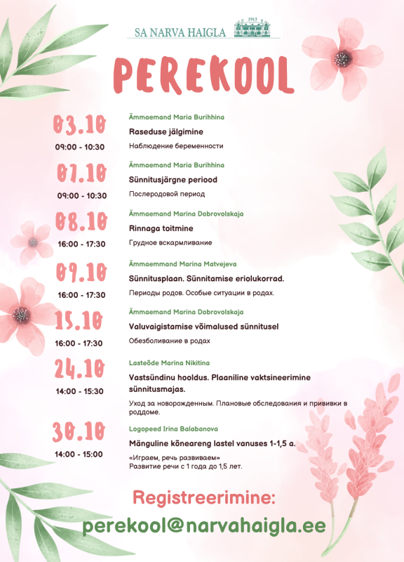 Регистрация на лекции по э-почте perekool@narvahaigla.ee (название лекции, имя- и фамилия, э-почта, телефон) или по ссылке